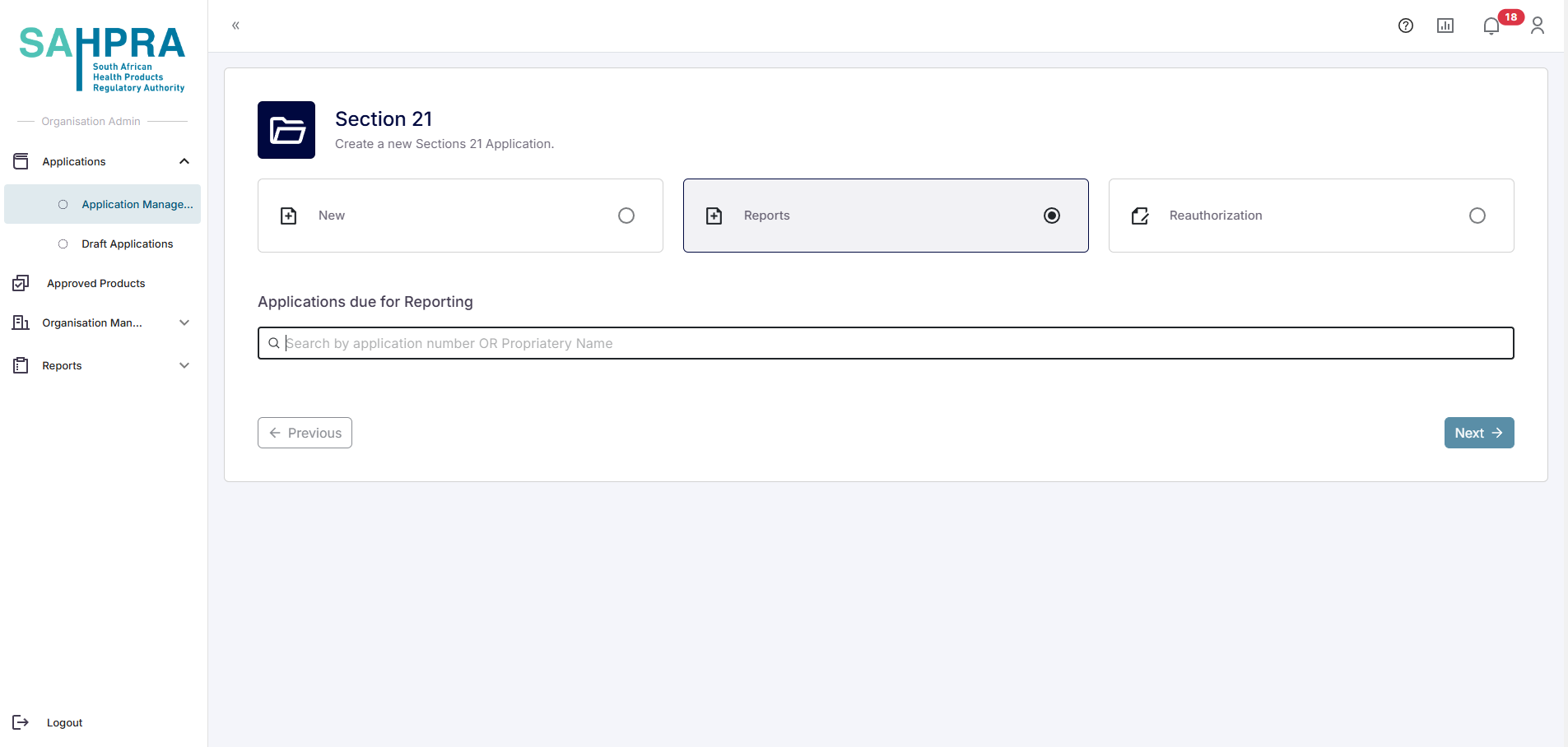 Select the “Reports” top navigation option from the 3 categories. Once selected the search bar can be used to search for the approved application which you wish to create a report for. Select an application by clicking the radio button on the application and click “Next’ to begin your Patient Outcome Report.